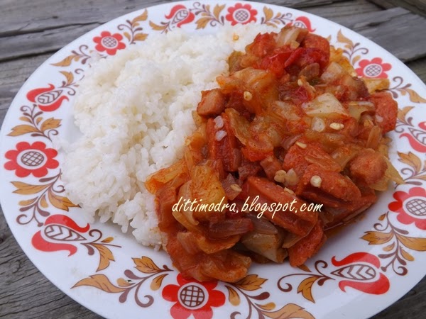 A felkockázott szalonna zsírját kisütjük, rávágjuk a szeletre vagy kockára vágott hagymát, kis idő múlva hozzátesszük  kockára vágott paprikát. Sózzuk, majd addig dinszteljük, még jól össze nem esik. Ezután mehet rá a pirospaprika, a felkockázott paradicsom, a karikára vágott kolbász. A paradicsom savanyúságát ellensúlyozva kevés cukrot adunk hozzá. Jól összekeverjük, ha kell, még utánasózzuk, és fedő alatt készre főzzük és a rizzsel tálaljuk.